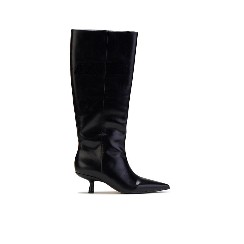 Zwarte lederen kniehoge puntige teen en stiletto hakken van moderne modieuze laarzen
