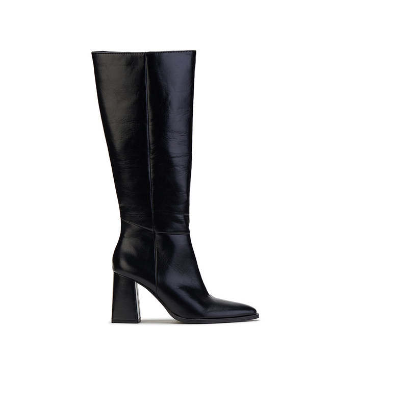 Zwarte leren kniehoge laarzen met dikke hakken, modern en modieus